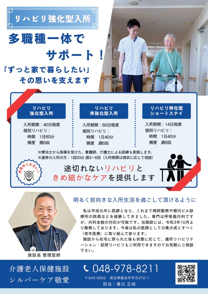 リハビリ強化型入所とは、在宅で療養されている方を対象に短期間入所していただき、リハビリ療法士による個別リハビリを強化して提供、在宅生活を支援するものです。